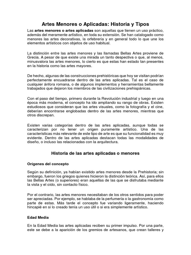 El concepto de artes mayores se utiliza en oposición al de artes menores o aplicadas, para considerar a éstas como artesanías y a aquellas como artes liberales, a las primeras como forma de expresión de la belleza y a las segundas como forma de ejecución de objetos en los que prima la utilidad, todo ello en el contexto de la valoración del trabajo intelectual y minusvaloración del. El concepto de artes mayores se utiliza en oposición al de artes menores o aplicadas, para considerar a éstas como artesanías y a aquellas como artes liberales, a las primeras como forma de expresión de la belleza y a las segundas como forma de ejecución de objetos en los que prima la utilidad, todo ello en el contexto de la valoración del trabajo intelectual y minusvaloración del. La música, una de las más conocidas bellas artes evidentemente, en este listado de los tipos de artes que existen (y que se engloban dentro de las siete) está la música, un arte que ha formado parte de la cultura desde hace muchísimos años.. (musica y literatura) artes aplicadas: